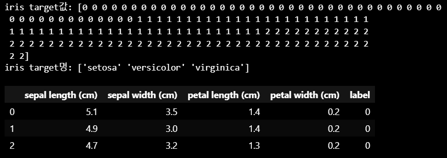 - label : 0 (setosa 품종), 1 (versicolort 품종), 2 (virginica 품종)