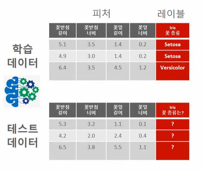 - 학습을 위한 다양한 feature(데이터를 설명하는 입력변수)와 분류 결정값인 label(정답) 데이터로 모델을 학습한 뒤, 별도의 테스트 데이터 세트에서 미지의 label을 예측하는 방법
