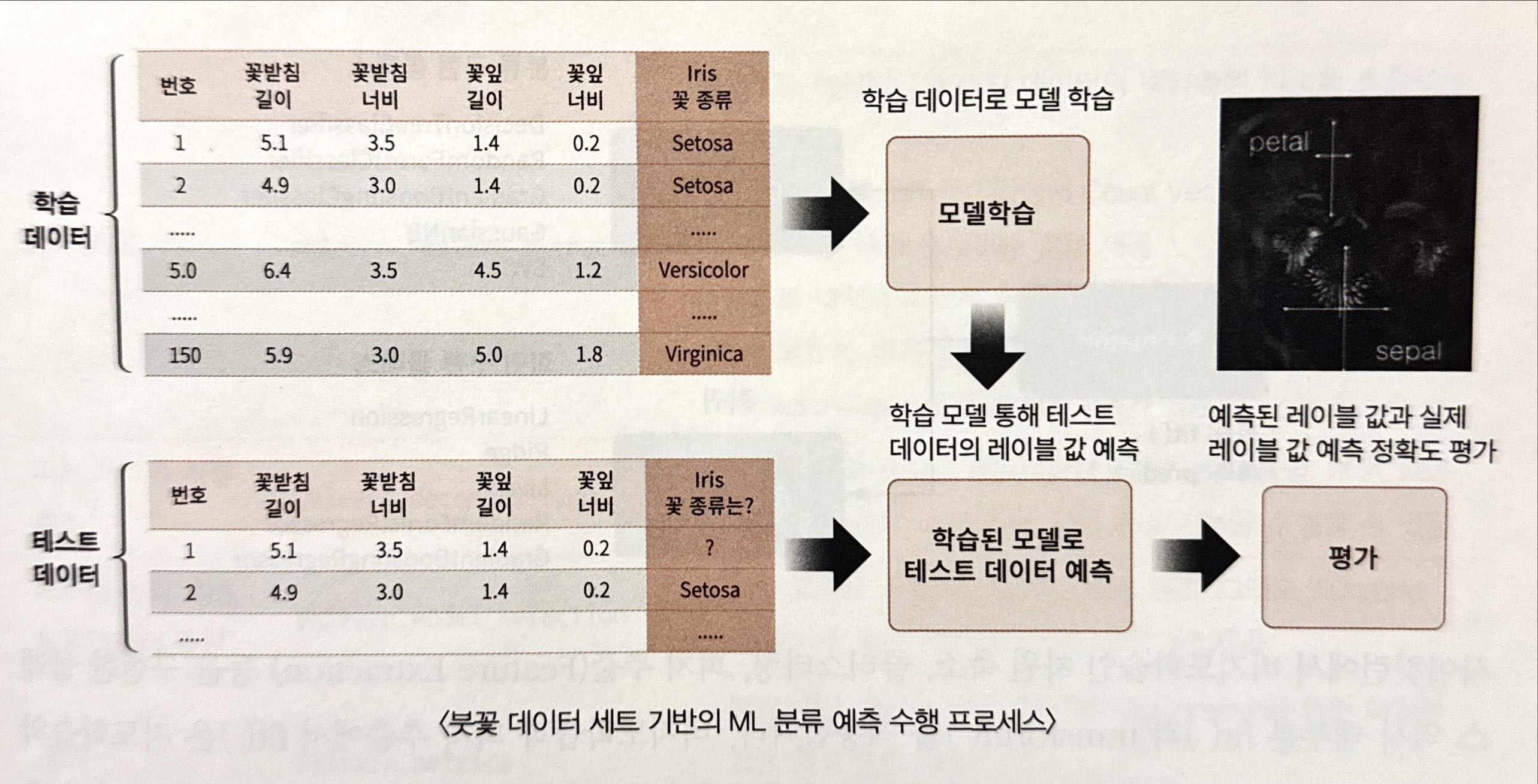 - 평가 : 예측된 결괏값과 테스트 데이터의 실제 결괏값을 비교해 ML 모델 성능을 평가