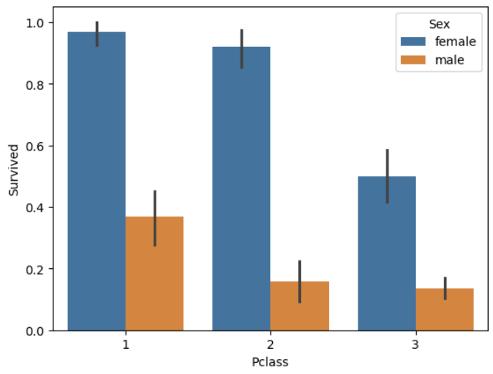 - 남성의 경우 일등실의 생존 확률이 이, 삼등실의 생존 확률보다 월등히 높음