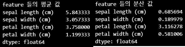 StandardScaler를 이용해 각 feature를 한 번에 표준화 StandardScaler객체를 생성한 후에fit()과transform()메서드에 변환 대상 feature 데이터 세트를 입력하고 호출하면 간단하게 변환transform()을 호출할 때 스케일 변환된 데이터 세트는 넘파이의ndarray이므로 이를 DataFrame으로 변환해 평균값과 분산 값을 다시 확인