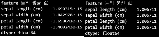 - 모든 column 값의 평균이 0에 아주 가까운 값으로, 분산은 1에 아주 가까운 값으로 변환됨