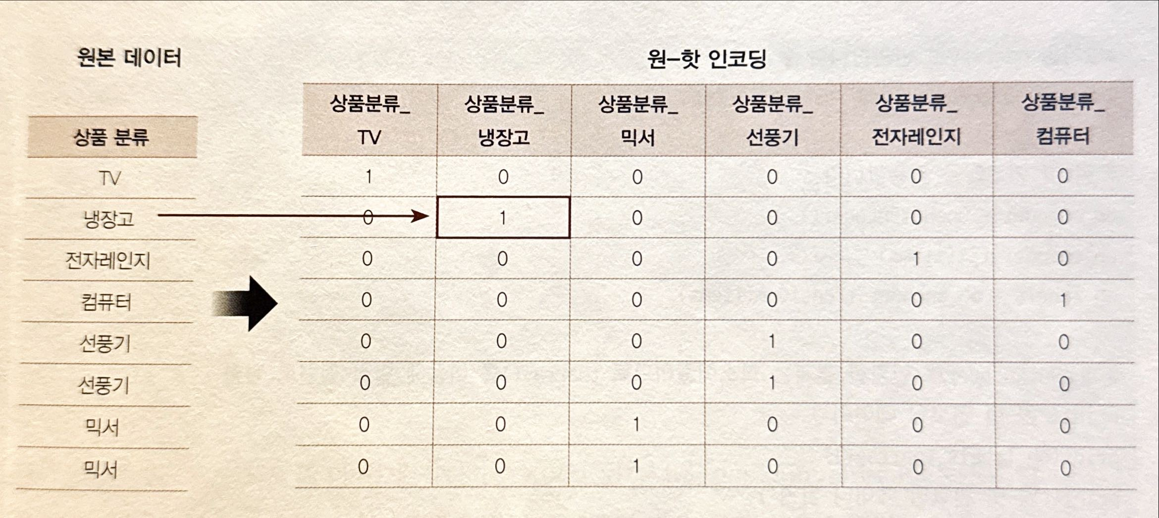- 즉, row 형태로 되어 있는 feature의 고유 값을 column 형태로 차원을 변환한 뒤, 고유 값에 해당하는 칼럼에만 1을 표시하고 나머지 column에는 0을 표시