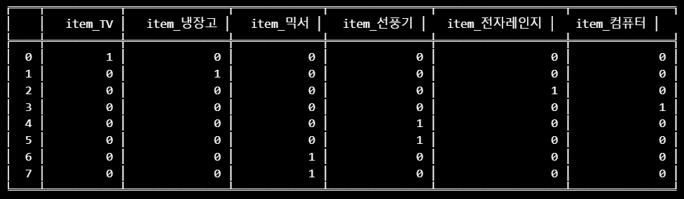 print(tabulate(pd.get_dummies(df).astype(int), headers='keys', tablefmt='fancy_outline'))