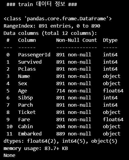 RangeIndex는 DataFrame 인덱스 범위를 나타내므로 전체 row 수를 알 수 있음- 현재 데이터는 891개 row로 구성되어 있음