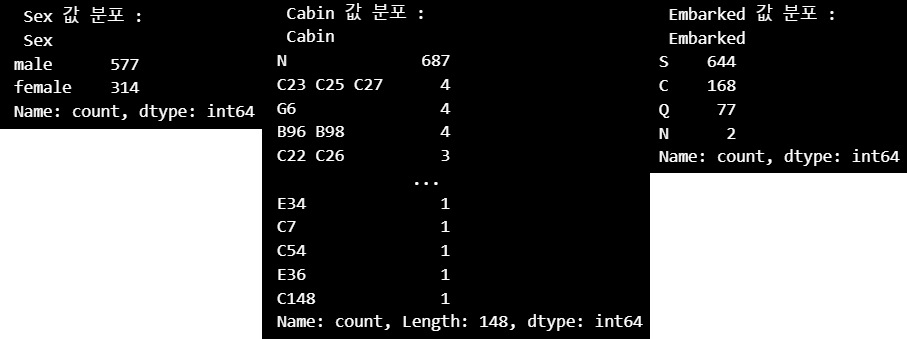 print('\n Embarked 값 분포 :\n',titanic_df['Embarked'].value_counts())