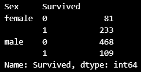 titanic_df.groupby(['Sex','Survived'])['Survived'].count()