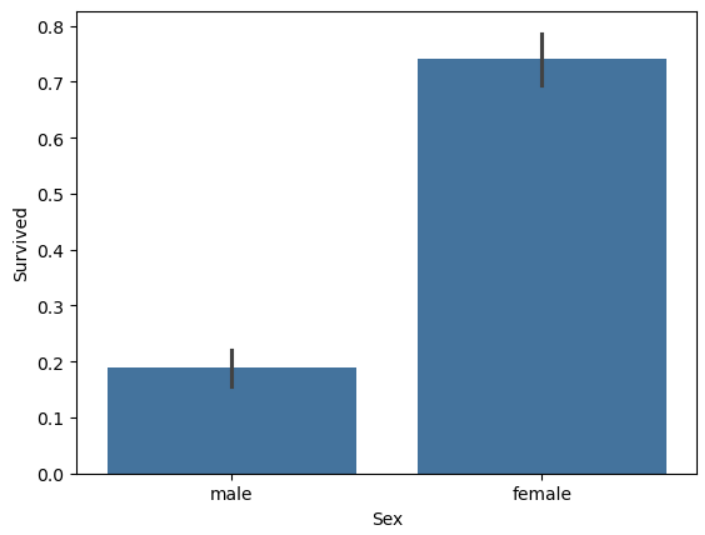 x='Sex':Sex별로 그룹화 (male,female)y='Survived':Survived값의 평균 계산- 막대 높이 : 그룹별