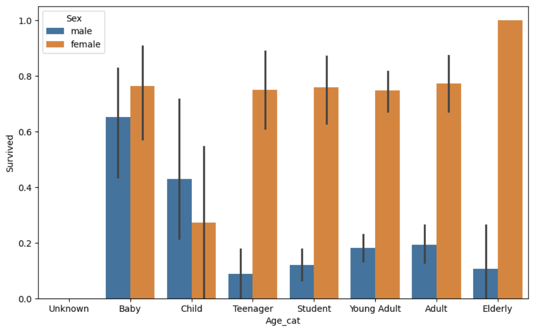 Baby의 경우 비교적 생존 확률이 높았지만, 여자Child의 경우 다른 연령대에 비해 생존 확률이 낮음 - 여자