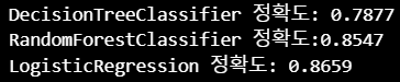 # 결정트리, Random Forest, 로지스틱 회귀를 위한 사이킷런 Classifier 클래스 생성